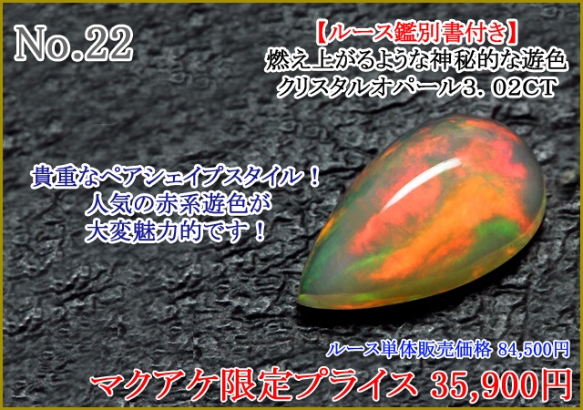神秘的な遊色効果がとても素晴らしいルースで特に結晶全体に広がる赤斑は大変印象に残ります。