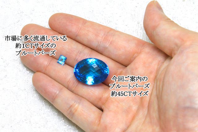 ブルートパーズ自体は産出量が多く宝石の中でも比較的身近な存在ですが、一般的に流通しているサイズは1~3CT前後で大きくても10CTぐらいが殆どを占めます。その理由は量産型の指輪やペンダント用に、同じ形で大量にカットすることが多く、必然的に世の中に出回るサイズは指先程度に落ち着いてくると言うわけです。