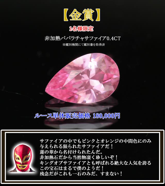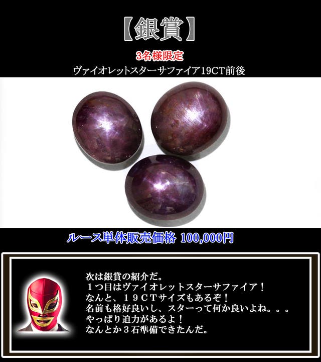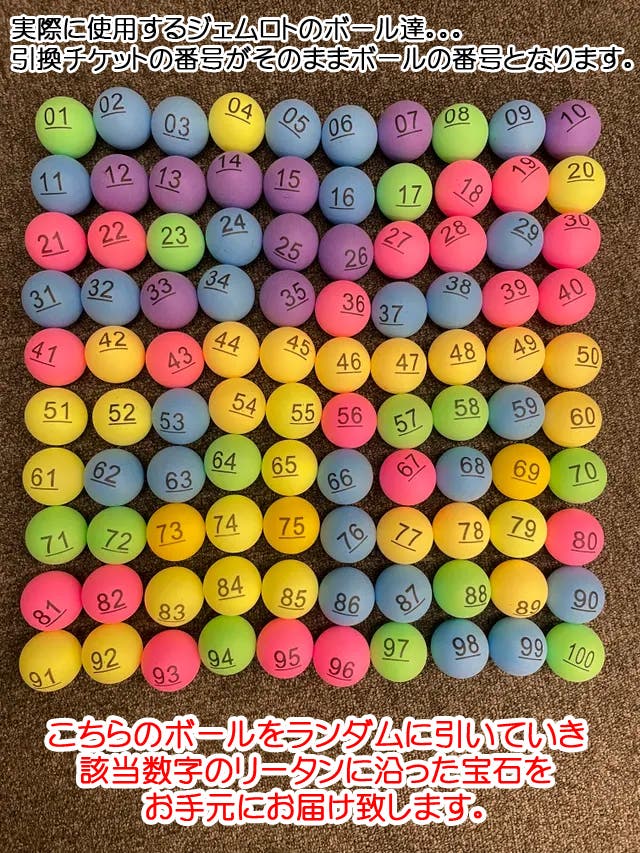 100口の番号が書かれたリターンの引換チケットを先着順で皆様に争奪して頂き、終了後に抽選会を行い該当の番号に沿った宝石を1石お届け致します。