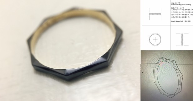 表に48の面をデザインし、お客様のサイズに合わせて面が均等になるよう計算。ご一緒に過ごした日々を指輪のデザインに致しました。