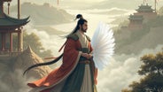 諸葛亮孔明:中国の三国志時代の名軍師で手に鳥の羽で出来た白羽扇を持つ。