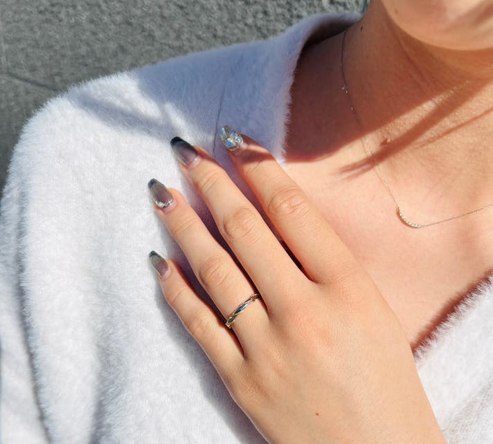 リングに巻き付くゴールドが立体感を生み、指先に奥行きのある美しさをプラス。