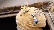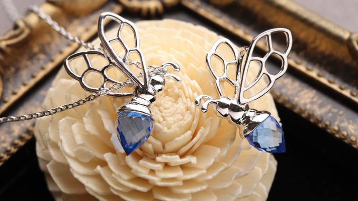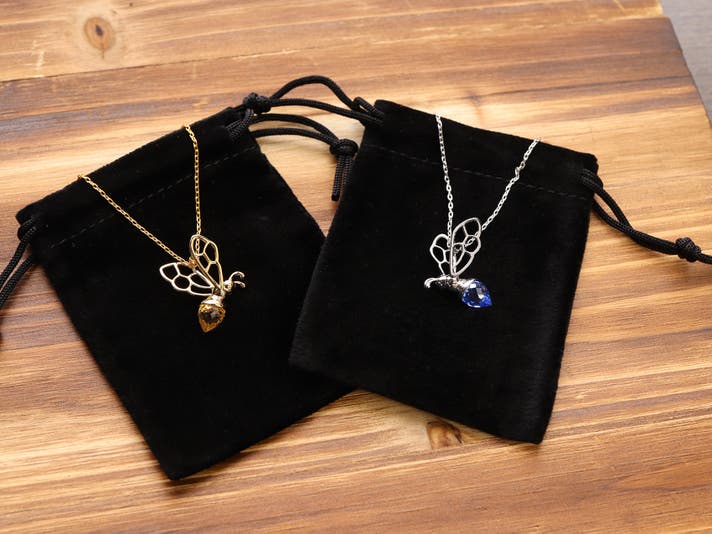 - ブリオレットカットの美しい2種の水晶「青空ブルー」と「陽だまりハニー」がキュートな蜜蜂に