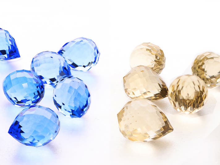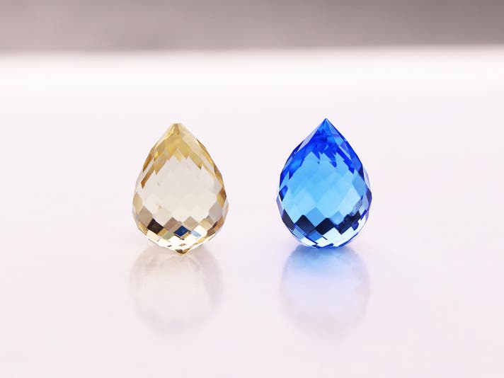 とろける蜜のようなイエロークォーツと鮮やかなブルークォーツ。人工水晶ならではの透明感と発色の良さが、きらめきを際立たせます。ブリオレットカットの複雑なカット面から幻想的に彩られた光が広がります。