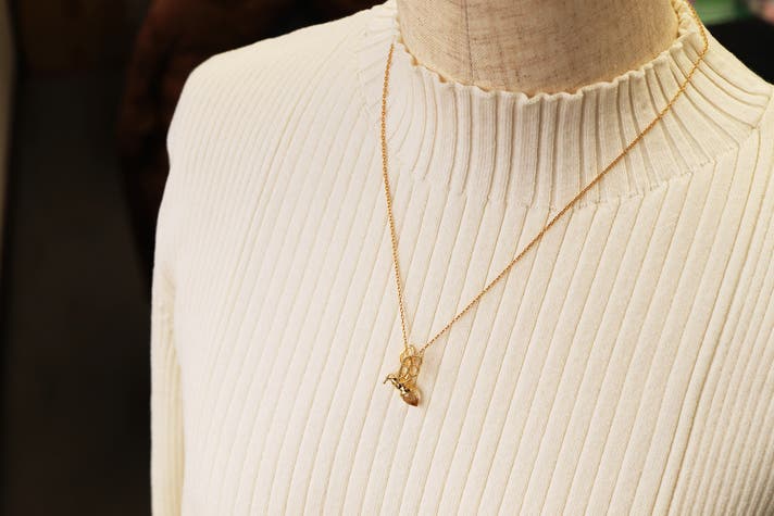 - 胸元でゆらめくネックレス、襟元を飾るピンブローチ、個性が際立つファッションアイテム