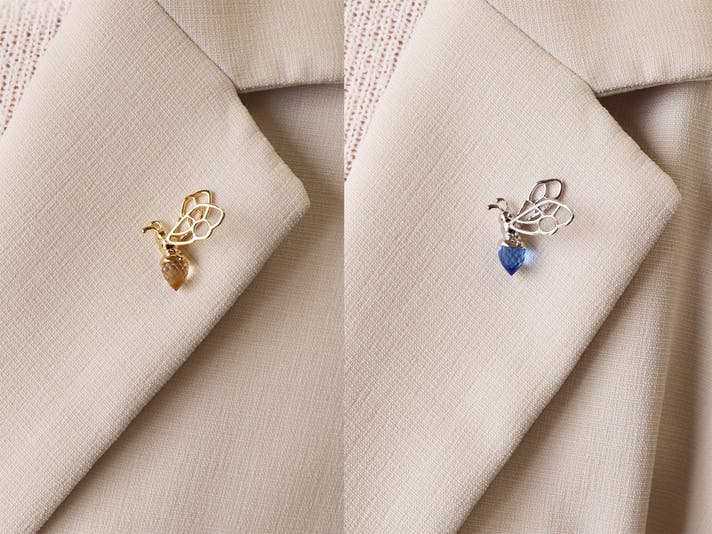 チャームポイントはちょっと尖ったクリスタルのお尻。ブリオレットカットの突端を蜂の針に見立てて、ふっくらとした曲線へと続く愛らしい姿をデザインしました。