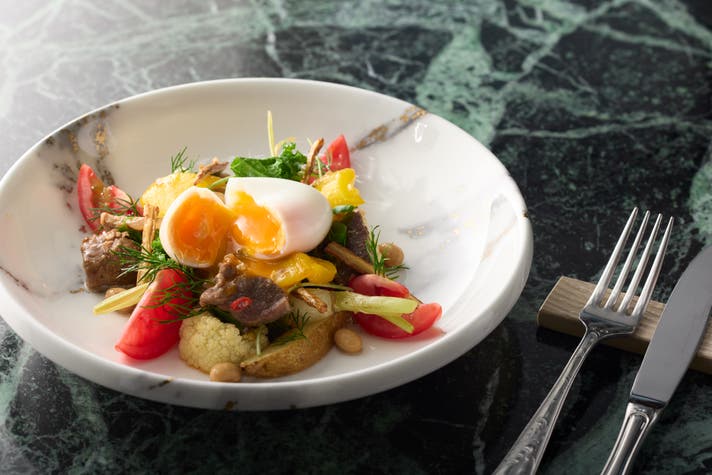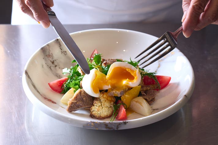 柑橘香る鹿肉と大豆のコンフィをベースに、お好みの野菜でつくるホットサラダ。