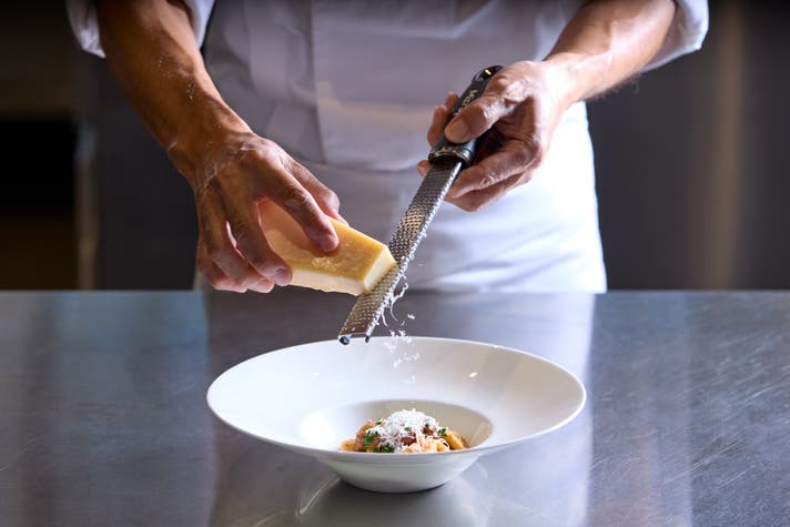 鹿肉とトマトの猟師風煮込みソースと合わせるのは、市販のジャガイモフレークでつくる、自家製ニョッキ。