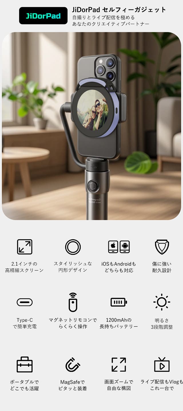 JiDorPad セルフィーガジェットは、セルフィー、ライブ配信、Vlog撮影をより簡単に、よりプロフェッショナルに演出するために開発された、超軽量・高機能なポータブルモニターです。