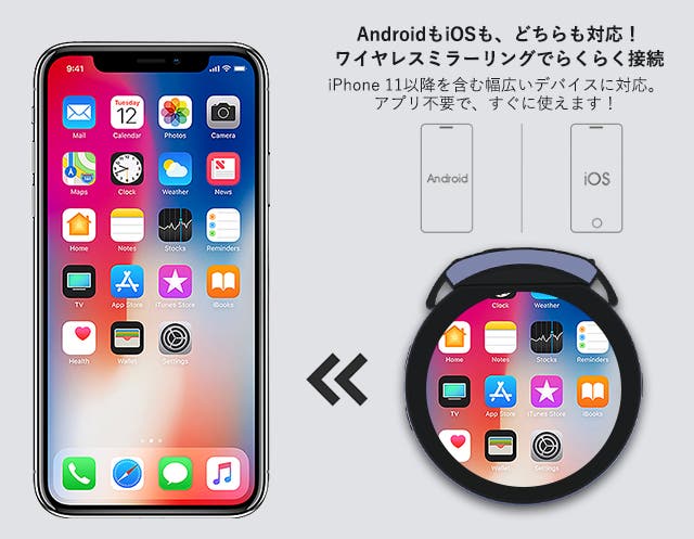 最新のワイヤレス技術により、スマートフォンの画面を遅延なくリアルタイムで表示。