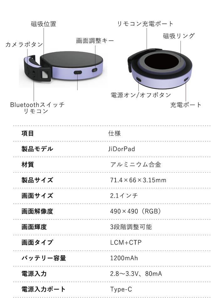 私たち開発チームは、ライブ配信文化に注目し、クリエイターの「ソロ撮影が難しい」「簡単に高品質な映像を撮りたい」という声から JiDorPad を開発。2.1インチ高解像度ディスプレイ(490x490)で美しい映像を実現し、MagSafe対応でピタッと装着、マグネットリモコンでワンタッチ撮影を可能に。円形デザインはSNS映えも意識。メイクやフィットネス、アウトドアなど多用途に対応し、どこでも使える軽量設計(71.4×66×3.15mm)にこだわりました。