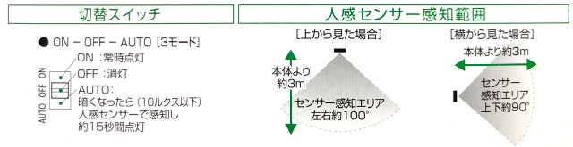 ・人感センサーは周囲の温度と人の体温との差が少ない場合など、感知性能が落ちたり誤作動する場合があります。