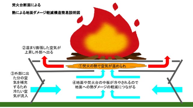 【焚火台】は熱による地面ダメージ軽減構造が組み込まれています。焚火による熱を利用した冷却システムにより、地面へのダメージに配慮した構造です。