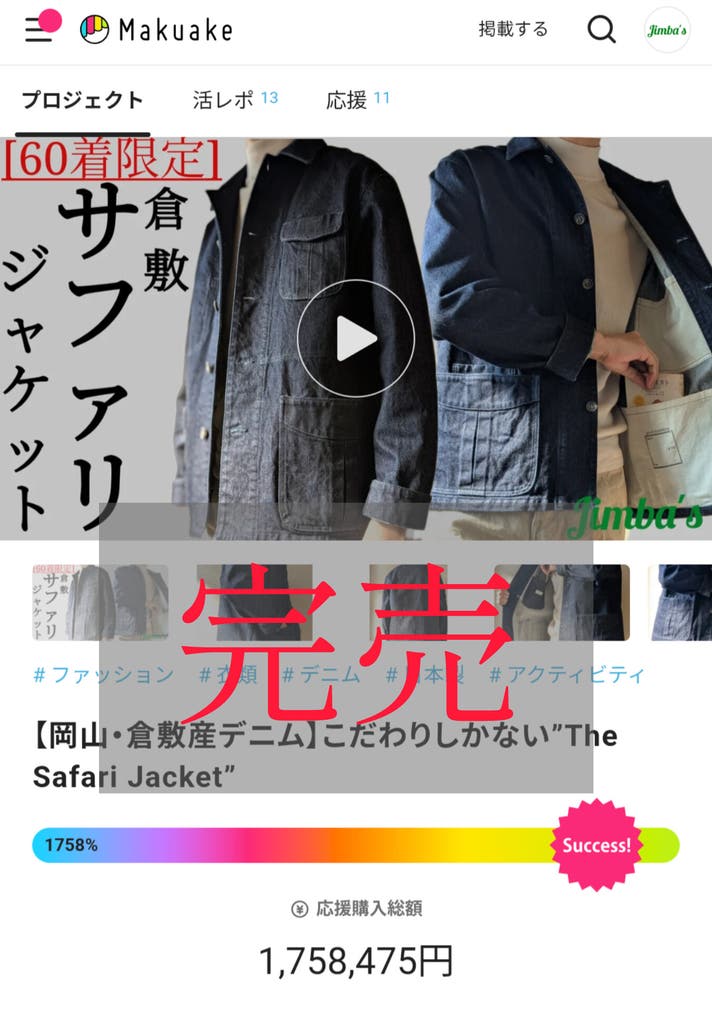 「Makuake(マクアケ)」は、実行者の想いを応援購入によって実現するアタラシイものやサービスのプラットフォームです。このページは、 ファッションカテゴリの 「第2弾!"岡山産・倉敷デニムのサファリワークジャケット"がセットアップで登場!!」プロジェクト詳細ページです。