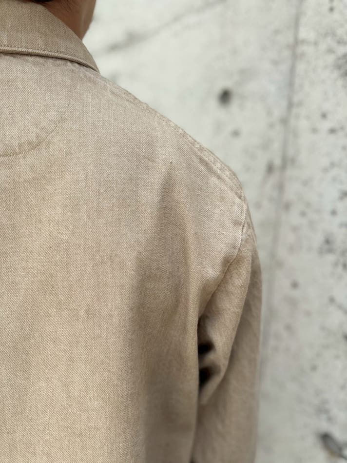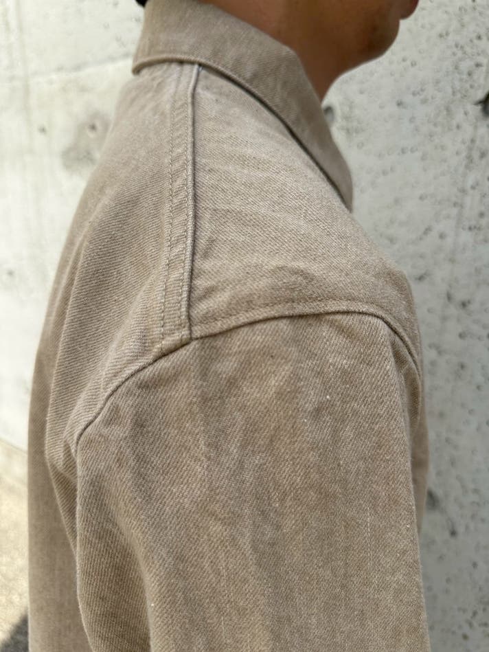 肩がごわつかないようにロックで始末し、ステッチもジャケットのように上側のみステッチを入れて仕上げています。