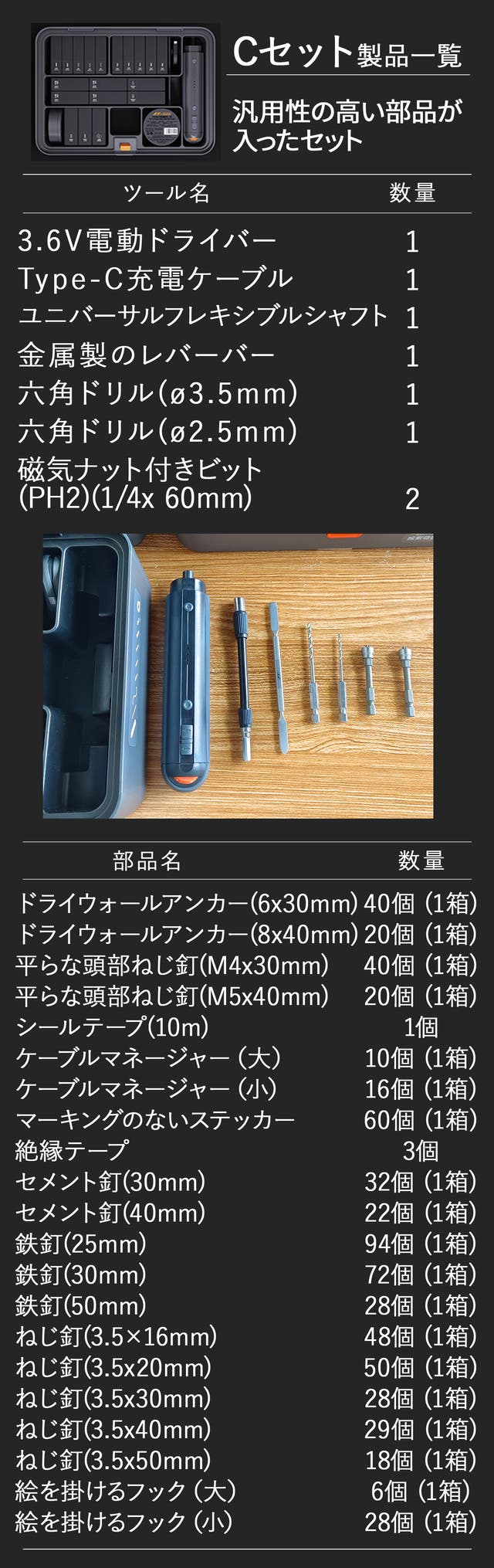 部品・電動ドライバーのセットで、いざという時も、本格的なDIYも対応。