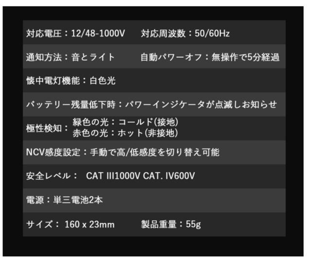 - 電圧の強弱を判断し音と光でお知らせ!効率的に測定を進められます!