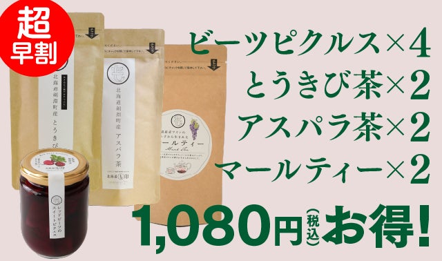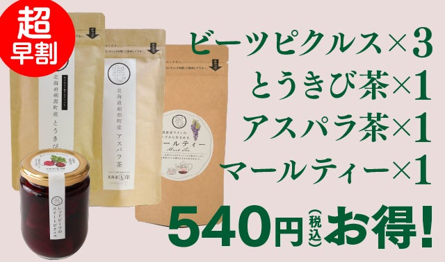 ♦【超早割】「スイートビーツピクルス」3個&「とうきび茶」、「アスパラ茶」、「マールティー」各1個 4,367円 限定25セット