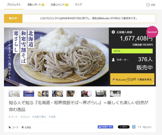 ▲2022年4月にマクアケで行った「和寒雪割そば」プロジェクト