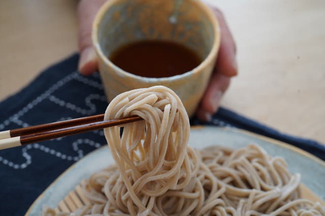 ④添付したつゆを希釈し、そばをつけてお召し上がりください。お好みで、ネギなどの薬味とともに召し上がってください。