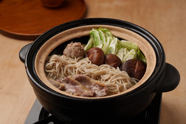 ③鍋の〆として、途中そばを入れて楽しんでください。この時、そばは凍ったままザルに入れ、さっと湯通したものをご使用ください。