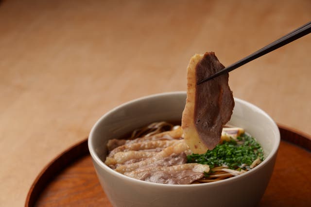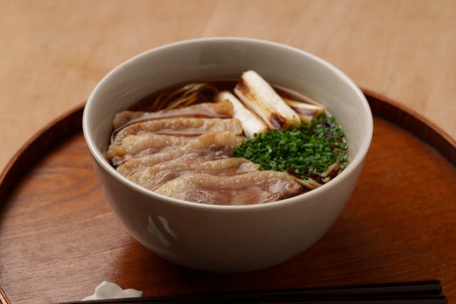 ④水洗いしたそばをサッと湯通ししてどんぶりに入れ、その上に鴨肉を盛り付けてください。最後にあたためておいたつゆをかけてお召し上がりください。お好みで、ネギ、七味などの薬味とともに召し上がってください。