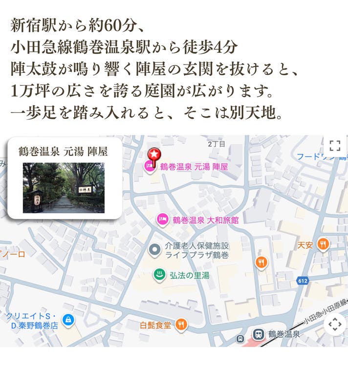 電車/東海道新幹線小田原駅下車、小田急線にて鶴巻温泉下車徒歩5分