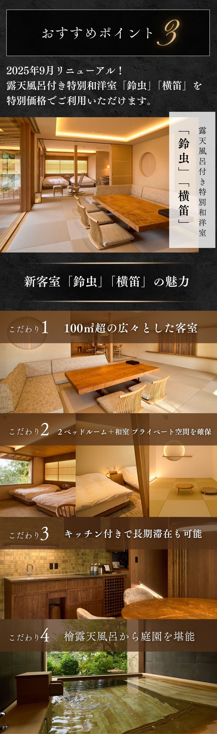 リニューアルした新客室「鈴虫」「横笛」に特別価格でご宿泊いただけます。キッチンとダイニングが付いており長期滞在も可能です。