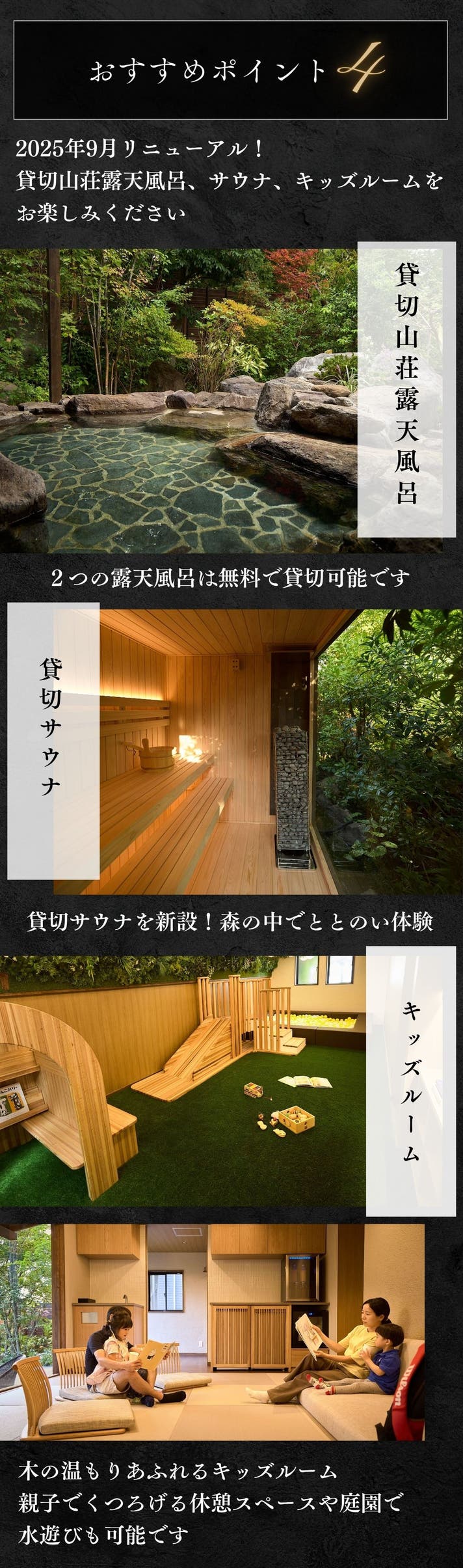- 【非日常空間】リニューアルした露天風呂付き新客室に宿泊、貸切山荘露天風呂やサウナも楽しめます!