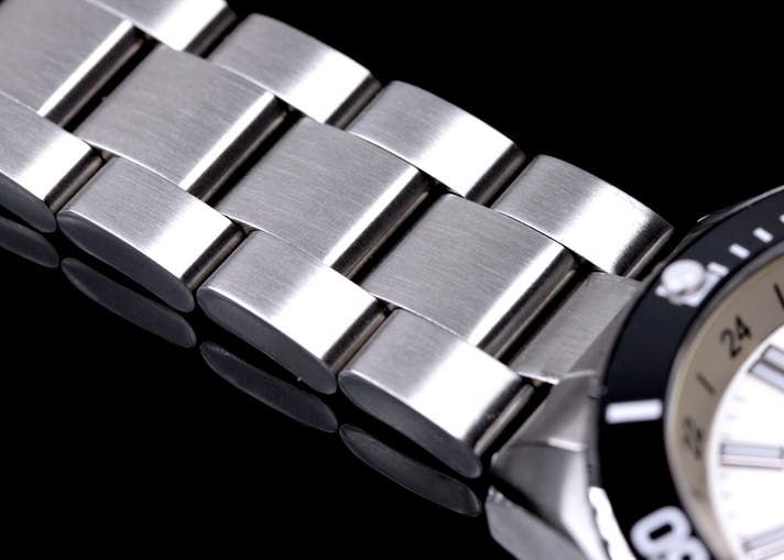 ダイアルをヘアライン加工とすることであえて武骨な感じを残し、艶のあるセラミックベゼルと対比させることで美しさと力強さを兼ね備えた仕上がりに。この絶妙なバランスを実現させるために何度も試行錯誤を重ねました。是非手にとってご確認下さいませ。また、ベルトもオールヘアライン加工のステンレスベルトを採用することで、文字盤との統一感が生まれ腕時計全体として一体感が生まれています。ここでもよりセラミックとの対比が美しくなるよう練りこまれています。