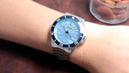 他にはないカラーリング、びわ湖 霞。スカイブルーのGMT針が印象的!