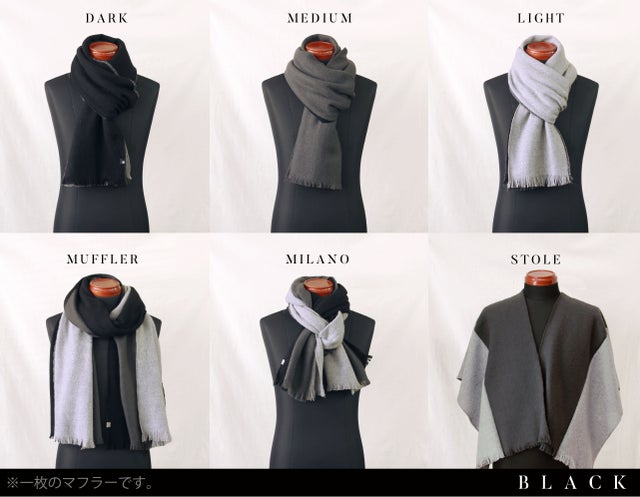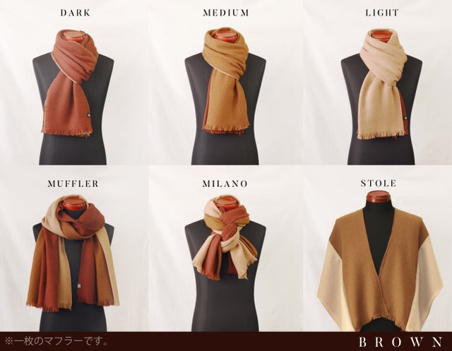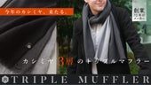 トリプルマフラーとは3層の異なるカラーを同時に織り、左片側1cm部分だけを接合するように織り、残り右側部分の3層を1枚ずつ開くようにした商品になります。 リバーシブルマフラー(表裏の色違い)やハーフ無地マフラー(右半分、左半分の色違い)などは2色分のカラーしか楽しめませんが、トリプルマフラーは3色分のカラーは勿論、捻る事によって多色使いのボリューム感のあるマフラーにもなります。また、広げて使えばストールにもなり、巻き方の色の割合いを変えることによって様々なスタイルにも変化致します。今年の冬のお気に入りとなる商品です。
