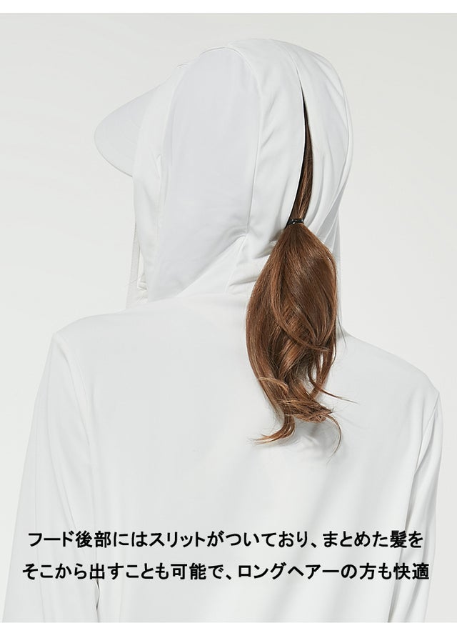 後部にはファスナーがあり、束ねた髪の毛を出すこともできます。フードの中で髪の毛がもたつくこともありません。
