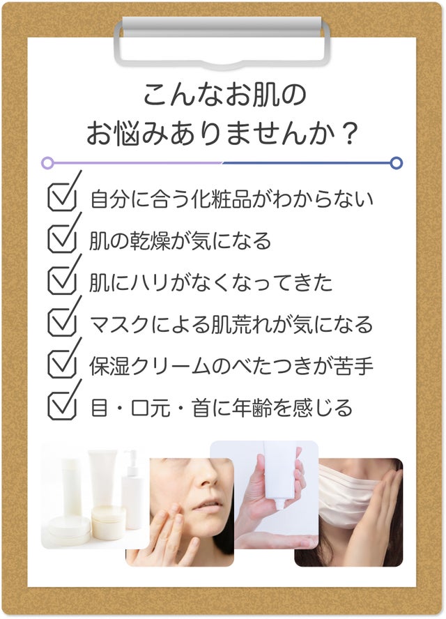 昨今、日常生活でマスクをつけて過ごすことが増えましたよね。マスクをしていると肌がうるおっているよう感じますが、実は外した直後に水分が一気に失われ、乾燥を招いてしまいます。また、目元や口元が気になったり、肌の弾力が落ちてきた気がするなど年齢に応じたお肌のお悩みを持っていても、どの化粧品が自分に合っているか見つけるのは難しいですよね。