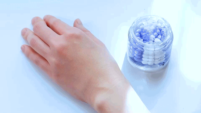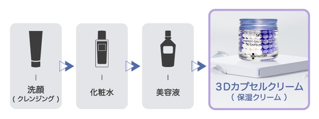 本製品は、3種類のレシピを使い分けすることで、顔の気になる部分に寄り添ったケアができる3in1エイジングケアクリームです。2色のカプセルクリームと透明ジェルを使い分けすることで、敏感肌や乾燥肌の方など、どなたの肌の悩みにも合わせてご使用いただけるよう、こだわって開発いたしました。