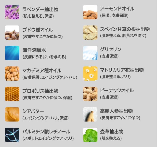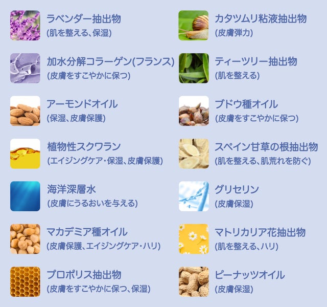 【全成分】水, BG, グリセリン、DPG, ミリスチン酸イソプロピル, ミツロウ, シア脂, エタノール, ステアリルアルコール, 水添ポリイソブテン、イソステアリン酸ソルビタン, PEG-60水添ヒマシ油, マカダミアナッツ種子油, (アクリロイルジメチルタウリンアンモニウム/VP)コポリマー、カタツムリ分泌液, カルボマー, セテアリルアルコール、ステアリン酸, TEA, ステアリン酸グリセリル, ステアリン酸PEG-100, 1,2-ヘキサンジオール, 香料, クロルフェネシン、ベタイン、フェノキシエタノール, ジメチコン, 酢酸トコフェロール、カプリリルグリコール、トレハロース, EDTA 2Na, アデノシン, アラントイン、アセチルテトラペプチド-5, 海水, カンゾウ根エキス、ラベンダーエキス、カミツレ花エキス、ティーツリーエキス, オタネニンジン根エキス, プロポリスエキス、アーモンド油, スクワラン, ブドウ種子油, パルミチン酸レチノール、マンガンバイオレット, ポリソルベート60, ピーナッツ油, リナロール, リモネン, シトロネロール, グリシン、グルタミン酸, 加水分解コラーゲン, ツボクサエキス、アスパラギン酸, トコフェロール, エチルヘキサンジオール, エチルヘキシルグリセリン, ロイシン、メチオニン, バリン、セリン、システイン, イソロイシン, アラニン, アルギニン, チロシン, トレオニン, プロリン, ヒスチジン、フェニルアラニン, ノナペプチド-1, アセチルヘキサペプチドー8, トリペプチド-1銅、トリペプチド-1, パルミトイルテトラペプチド-1, ヘキサペプチドー8, パルミトイルペンタペプチド-4、リシン, ジペプチド-2, グルタチオン