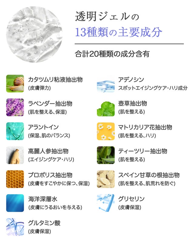 顔全体をしっとりみずみずしい肌の「うるおいケア」に特化した成分のジェルです。