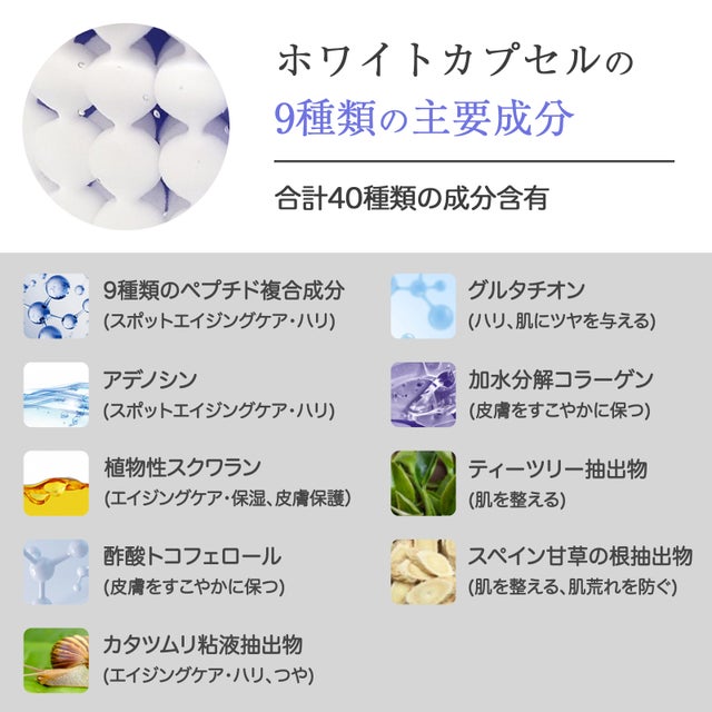- 新発想「2色のカプセル+透明ジェル」を肌の悩み毎に使い分け!抜群の保湿力で肌にハリと透明感を!