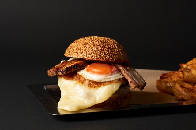 チーズステーキを鉄板でこんがりと焼き、自家製のベーコンと平買い卵の目玉焼きで究極のベーコンエッグチーズバーガーが完成しました! 自家製のマスタードをトッピングするとより深みのあるハンバーガーに返信です!!