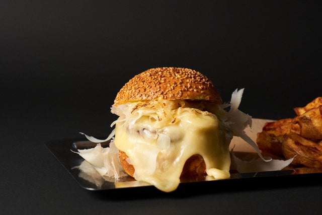 優しい味わいのチーズをたっぷり削り、まるで雪のようにふわふわにハンバーガーの上に乗せました。 最後の仕上げにバーナーで炙るとまるで雪どけのようにとろりととろけるチーズと香ばしい香りが食欲を倍増させてくれます!