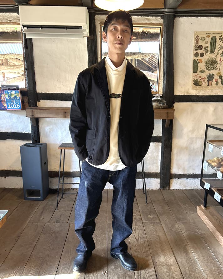 ブラックツイルジャケット×インディゴデニムパンツ