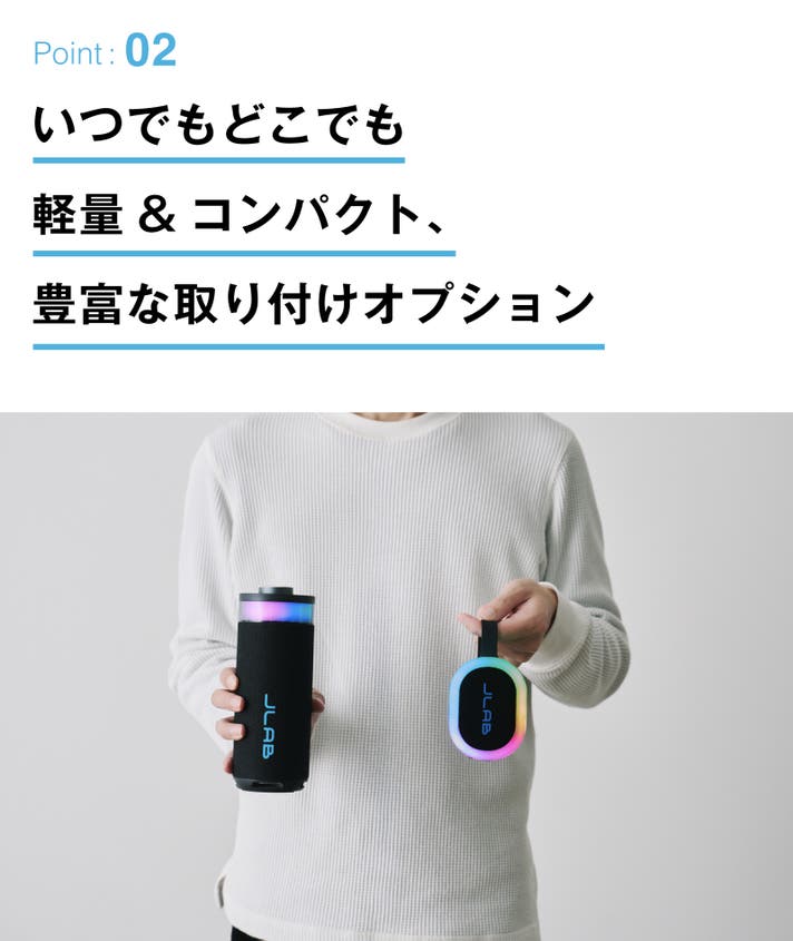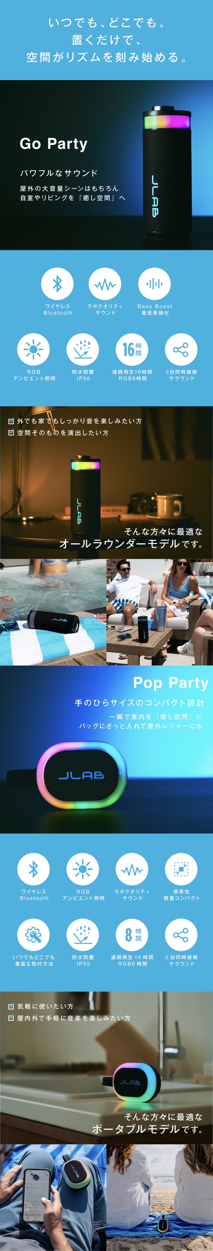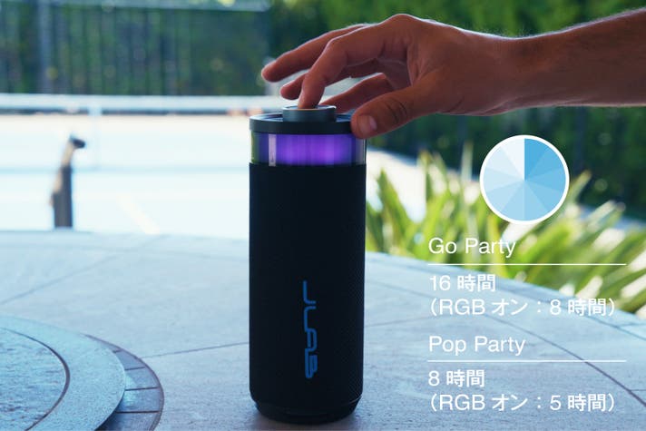 フル充電で「Go Party」は16時間(ライト使用時8時間)、「Pop Party」は8時間(ライト使用時5時間)の連続使用が可能。