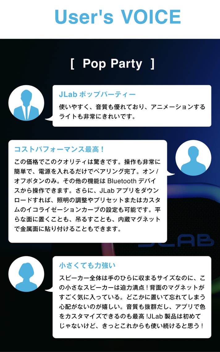 「Pop Party」にも2インチドライバーが搭載されていて、いずれもラボクオリティのサウンドを実現します。