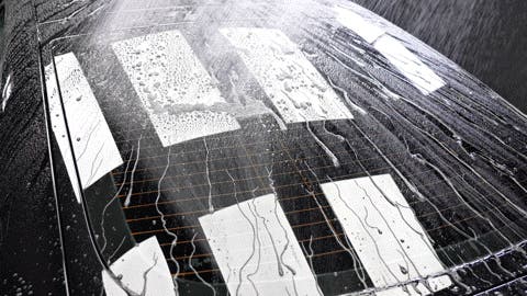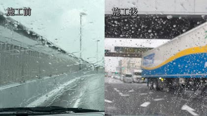 走行実験では、40km/hでも雨粒が滑り落ち、ワイパー頻度は半減。