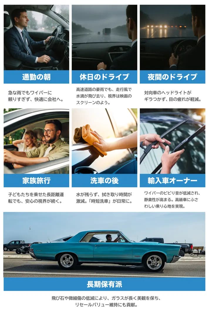 ワイパーの動きにも強く、剥がれず、視界を守り抜く。