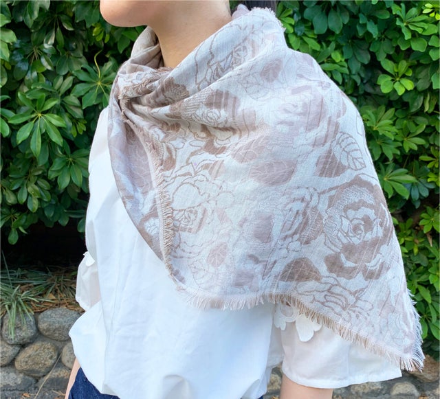 同様に、レースとローズ2柄展開の、2重に重ねたシルクガーゼマフラーです。ストールの約半分のサイズ。さっと巻きたい人におすすめです。