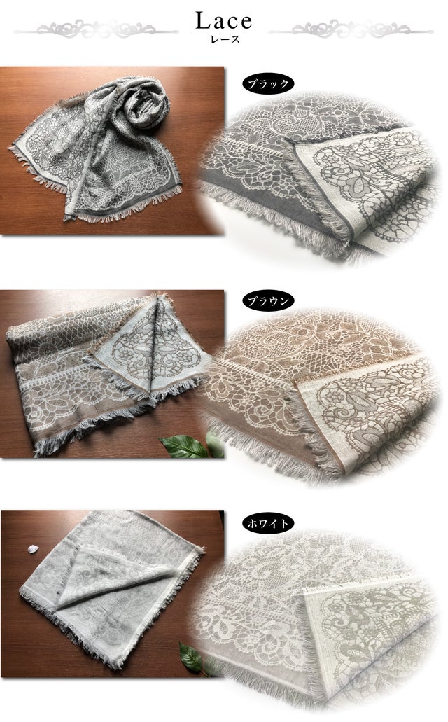 ※色は、ストール・マフラー・マスクそれぞれで、レース【ブラック/ブラウン/ホワイト】、ローズ【ピンク/ブルー/ブラウン】の各柄3色からお選びいいただけます。