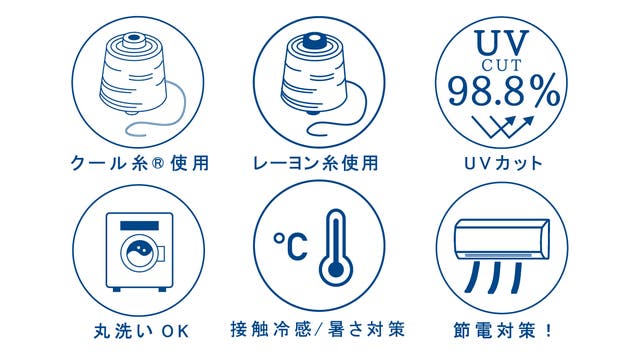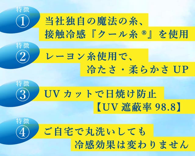 タオルメーカーが開発したロングセラー素材、魔法のクール糸®によるひんやり接触冷感で、暑さ対策に加え、UVカット効果もあるので、夏の様々なシーンで活躍します。