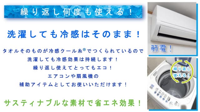 電気不要・水不要・冷蔵不要の省エネなので、自然にクール糸®︎+レーヨンの力のみで涼しく冷感を与え、夏を涼しく過ごしていただけます。