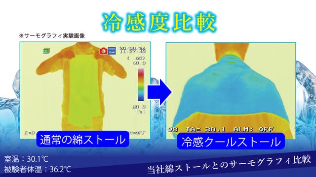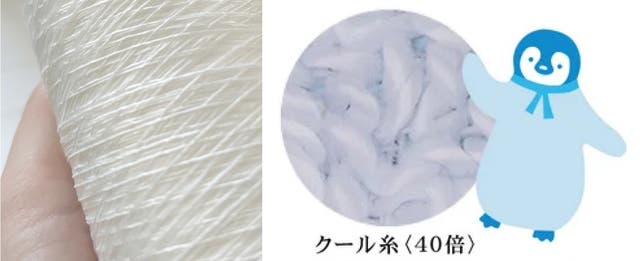 クール糸とは、弊社で開発をした「接触冷感作用で冷たく感じる」特殊な素材です。触った瞬間に熱が素早く拡散するので、冷たく感じます!